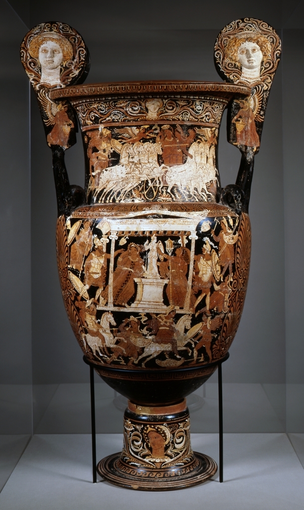 While vising the Michael C. Carlos Museum at Emory University, I noticed a krater inside of a small room. This krater was created around the years 340-330 BC. It’s a large krater, standing at forty-eight by twenty-three inches. It is made of ceramic and depicts Iliupersis, or the Sack of Troy. This krater is beautiful but it also is an example of red-figure painting, Greek art, and tells the story of the Sack of Troy.